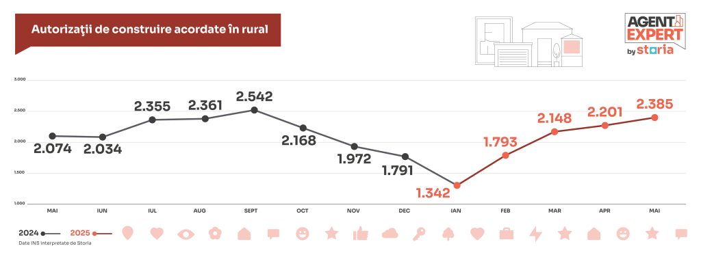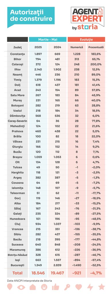 Astfel, la nivel național au fost emise în luna mai aproape 3.400 de autorizații, cu 10% mai multe comparativ cu luna mai a anului trecut. Mediul urban a rămas în preajma pragului de 1.000 de autorizații, în creștere cu mai puțin de 1%, în timp ce mediul rural a înregistrat o creștere cu 15%, la aproape 2.400 de autorizații.