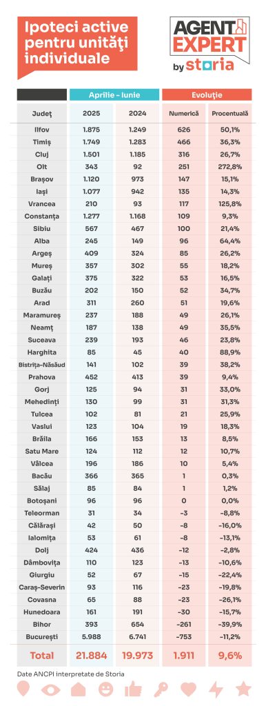 În prima jumătate a anului, numărul de ipoteci active a depășit 44.000, iar creșterea este cu 11% comparativ cu perioada similară din 2024. În acest caz, inclusiv piața din București este pe teritoriu pozitiv, cu 13.000 de ipoteci active (+1%), în timp ce marile județe imobiliare au raportat creșteri procentuale formate din două cifre: Ilfov (+48%), Timiș și Cluj (ambele cu +30%) sau Brașov (+16%).
