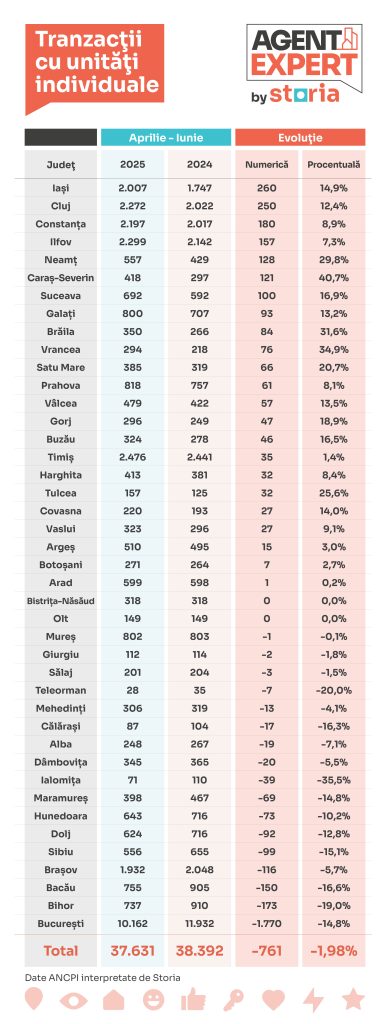 Dintre județele de top, scăderi au fost raportate în Iași (-32%, 3.300 de tranzacții), Brașov (-10%, 3.700 de tranzacții) și Timiș (-5%, 4.700 de tranzacții).