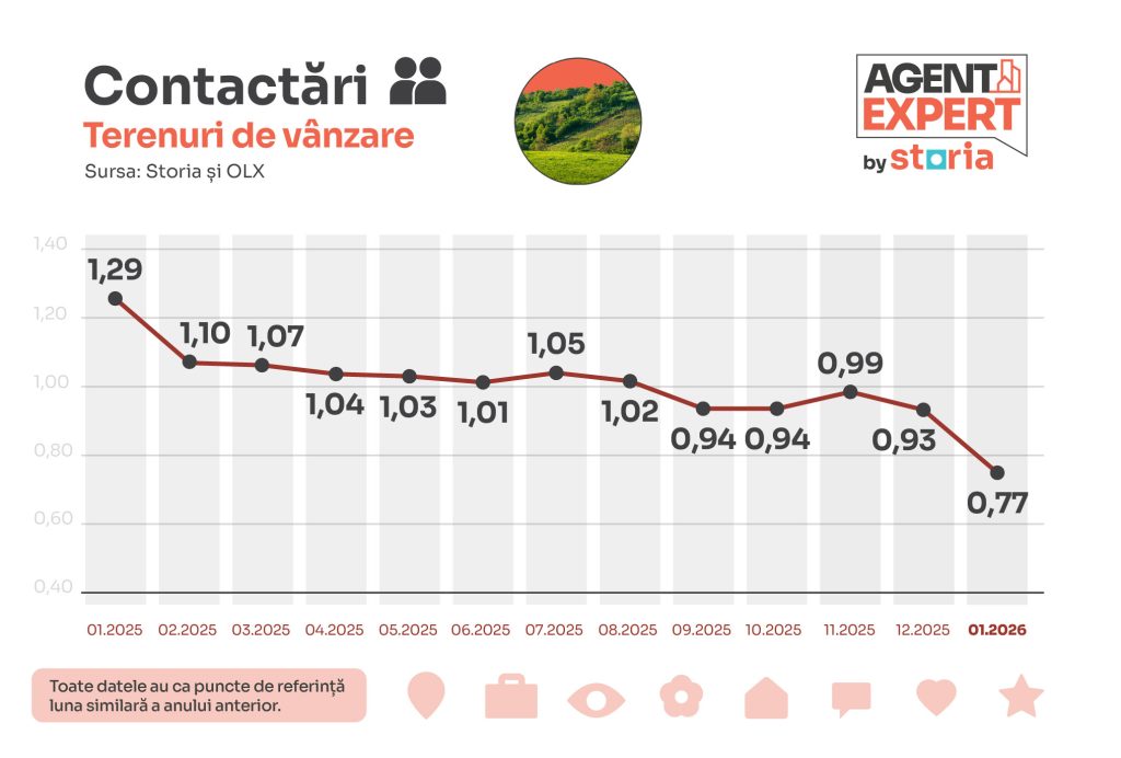 Terenurile disponibile la vânzare pe platformele Storia și OLX Imobiliare au înregistrat o evoluție foarte asemănătoare cu cea raportată pentru apartamentele aflate la vânzare. Astfel, în prima lună a acestui an, contactările directe au scăzut cu 23% față de ianuarie 2025, concomitent cu o scădere cu 26% pentru afișări.