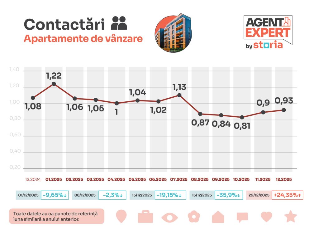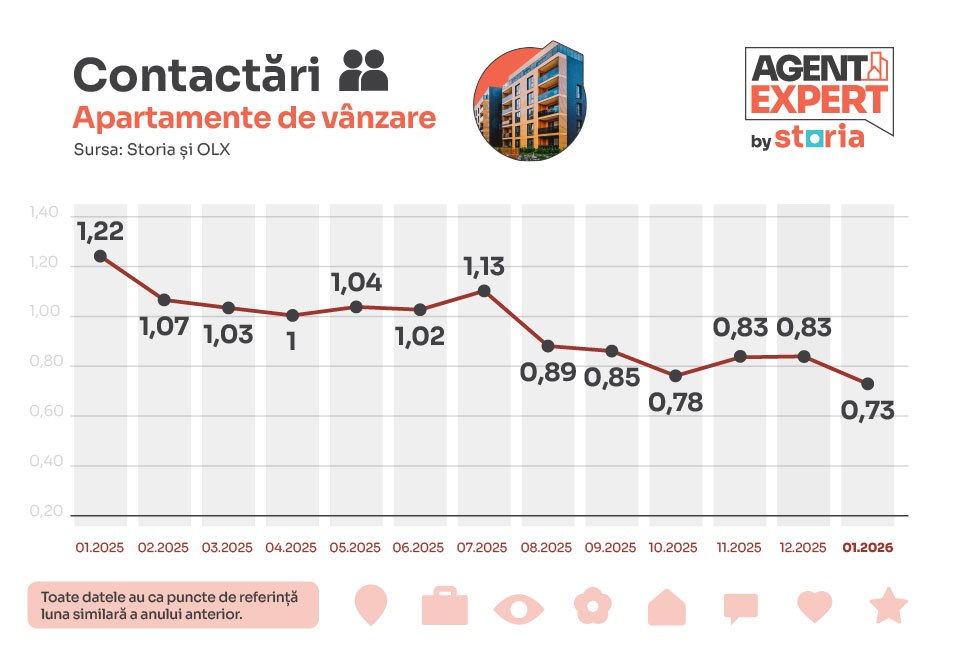 Datele colectate de pe platformele imobiliare Storia și OLX Imobiliare arată că în luna ianuarie 2026 numărul de contactări directe pentru cumpărarea de apartamente a scăzut cu 27% comparativ cu ianuarie 2025, concomitent cu o scădere cu 23% a numărului de afișări.