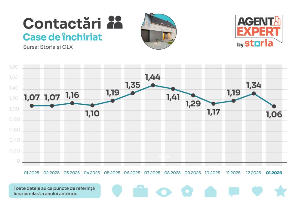 În plus, la fel ca în cazul apartamentelor de vânzare, datele indică o creștere semnificativă comparativ cu decembrie 2025 la ambii parametri, în acest caz cu 28% pentru numărul de contactări directe și cu 38% pentru numărul de afișări.