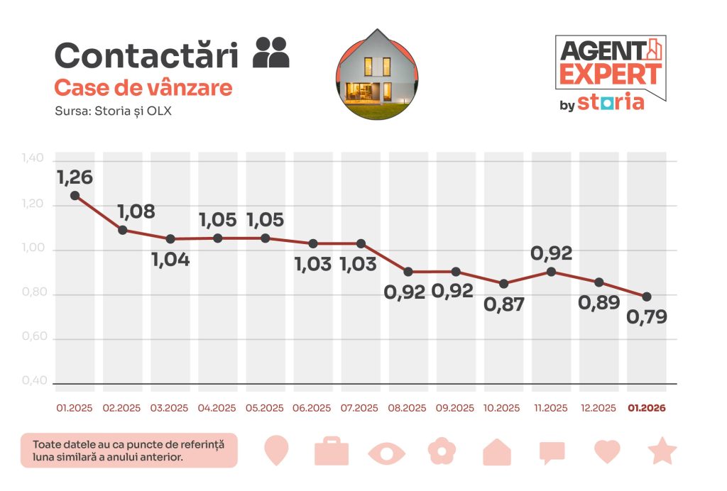 Astfel, anul 2026 a început cu o scădere cu 12% a numărului de contactări directe comparativ cu ianuarie 2025, în timp ce numărul de afișări a scăzut cu 10% în același interval de timp, potrivit datelor agregate de pe Storia și OLX Imobiliare.